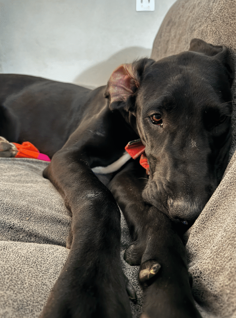 Meet Layla! Layla is a beautiful black Great Dane puppy, estimated to be about 7-8 months old. She’s shy at first, but once she warms up, her goofy, gentle personality shines through. True to her Dane roots, she loves zoomies, playful neck nibbles with other dogs, and happily chomping on her Nylabones.